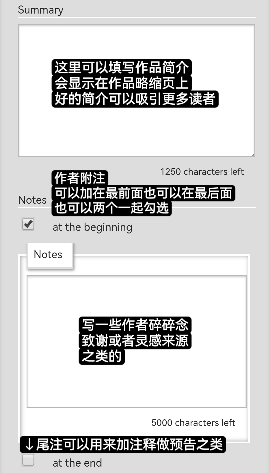 8. **Notes：**&#x4F5C;者备注；可以用来碎碎念、致谢、做解释等等，有加在作品之前或之后两个选项，可以多选。