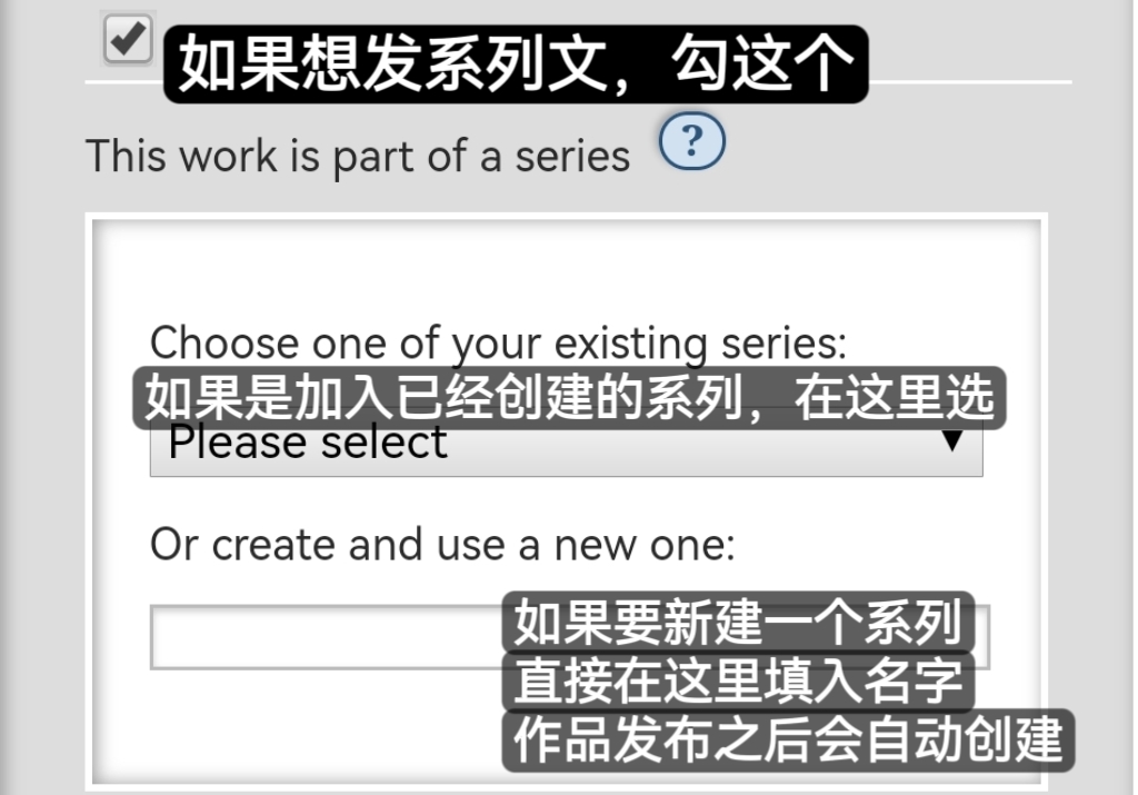 如果你已经创建过系列并想将本作品加入该系列，直接在Choose one of your existing series的下拉列表中选择。如果你想要新建一个系列，直接在Or create and use a new one里填写你新系列的名字。