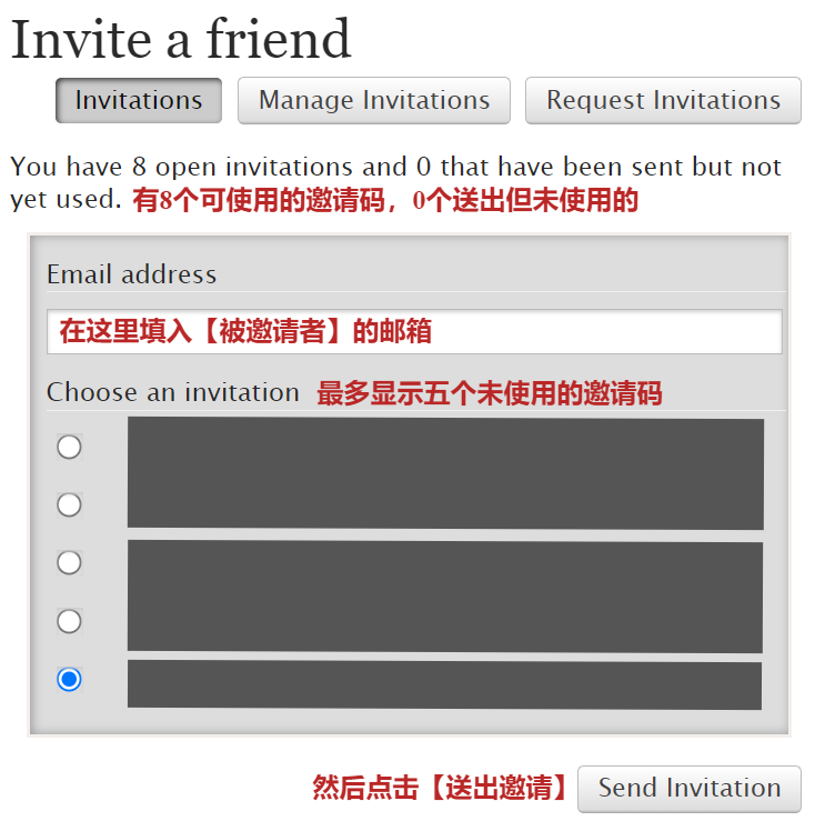 请注意：每个已注册用户拥有的邀请码数量是有限的，被使用过的邀请码即作废；另外，被邀请者在使用邀请码创建账号后，用户名和邮箱将对邀请者可见。